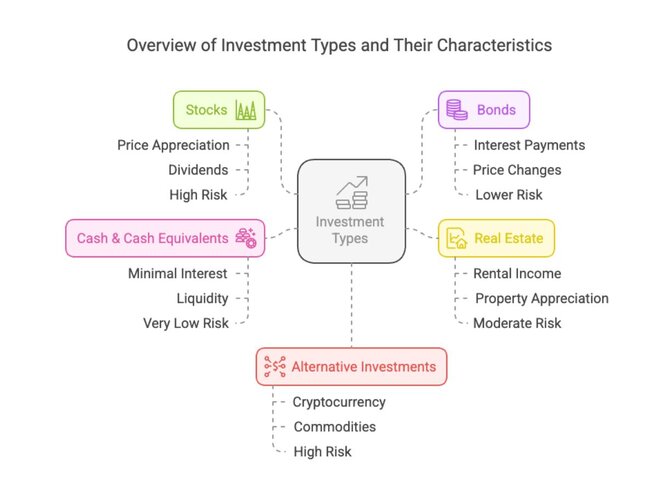 1) Stocks (Equities): Ownership in a Company When you buy stocks, you are essentially buying a piece of a company. How Stocks Make You Money: Price appreciation: If the company grows, so does your stock value. Dividends: Some companies share their profits with investors. Risk Level: High (but great for long-term wealth) Best For: Building long-term wealth over decades. Example: If you had invested $1,000 in Apple stock in 2000, it would be worth over $400,000 today. Stocks outperform most investments over the long run - but they can be volatile in the short term. 2) Bonds (Fixed Income): Loans to Governments & Corporations Buying a bond is like lending money to a company or government. In return, they promise to pay you interest at a fixed rate. How Bonds Make You Money: Risk Level: Lower than stocks, but returns are also lower. Best For: Stability, income, and diversification. Example: Government bonds (like U.S. Treasury bonds) are considered one of the safest investments - but they don’t grow wealth as fast as stocks. 3) Real Estate: Investing in Physical Property Real estate is not just about owning a home… It is also one of the oldest ways to build wealth. How Real Estate Makes You Money: Risk Level: Moderate (can be stable, but requires capital and management). Best For: Generating passive income and long-term growth. Example: Buying a rental property can create steady monthly income, but it also comes with responsibilities like maintenance and tenant management. 4) Cash & Cash Equivalents: Safety & Liquidity Cash is the safest asset, but it comes with a hidden risk: Inflation. How Cash Makes You Money: Risk Level: Very low, but inflation erodes value over time. Best For: Emergency funds and short-term savings. Example: A savings account might feel “safe,” but if inflation is 3% and your bank pays you 1% interest, you’re losing money in real terms. 5) Alternative Investments: Crypto, Commodities, & More Alternative investments don’t fit into the traditional stock/bond/cash categories, since they have their own unique risks and rewards. Types Include: Risk Level: Varies widely - can be high-risk, high-reward. Best For: Diversification and investors with high-risk tolerance. Example: Bitcoin gained over 1,000% in five years, but also lost half its value in a single year. Alternative assets can be exciting, but they aren’t for the faint of heart.