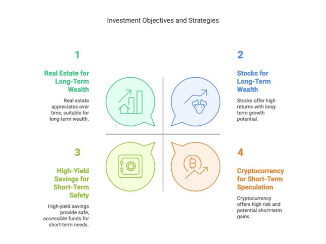 Not all investments serve the same purpose. Your financial goals and risk tolerance determine which investments are right for you. Here’s how different assets align with four common investment objectives: 1) Building Long-Term Wealth Best options: Stock and real-estate. Why? These investments offer higher returns over time, driven by compounding growth. Example: Who this is for: 2) Generating Passive Income Best options: Bonds, dividend stocks, rental properties. Why? These provide regular cash flow with lower risk than growth-focused investments. Example: Who this is for: 3) Short-Term Safety & Liquidity Best options: Cash, money market accounts, short-term bonds. Why? These assets offer stability, liquidity, and minimal risk - but lower returns. Example: Who this is for: 4) Diversification & Hedging Against Inflation Best options: Commodities (gold, oil), real estate, alternative investments. Why? These assets often hold value or rise when inflation is high. Example: Who this is for: