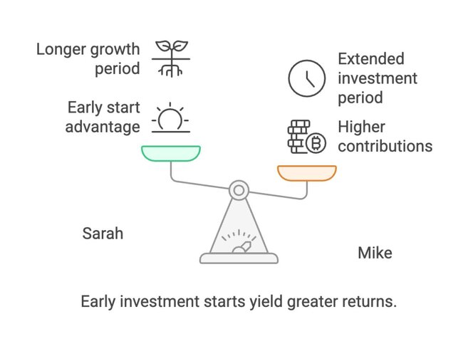 Emma starts investing at 22—just a few hundred bucks a month. Jack waits until 32 and doubles her contributions.